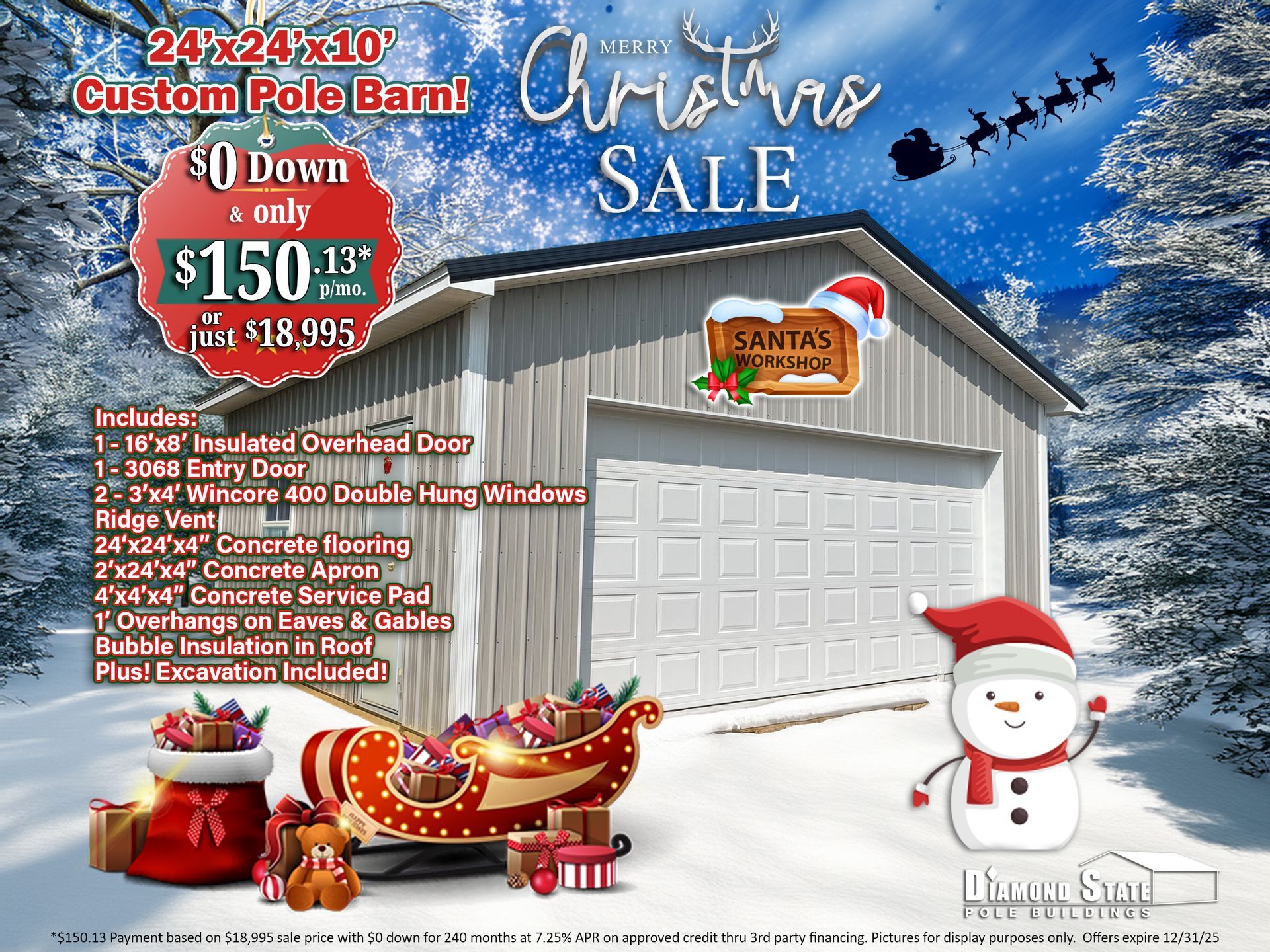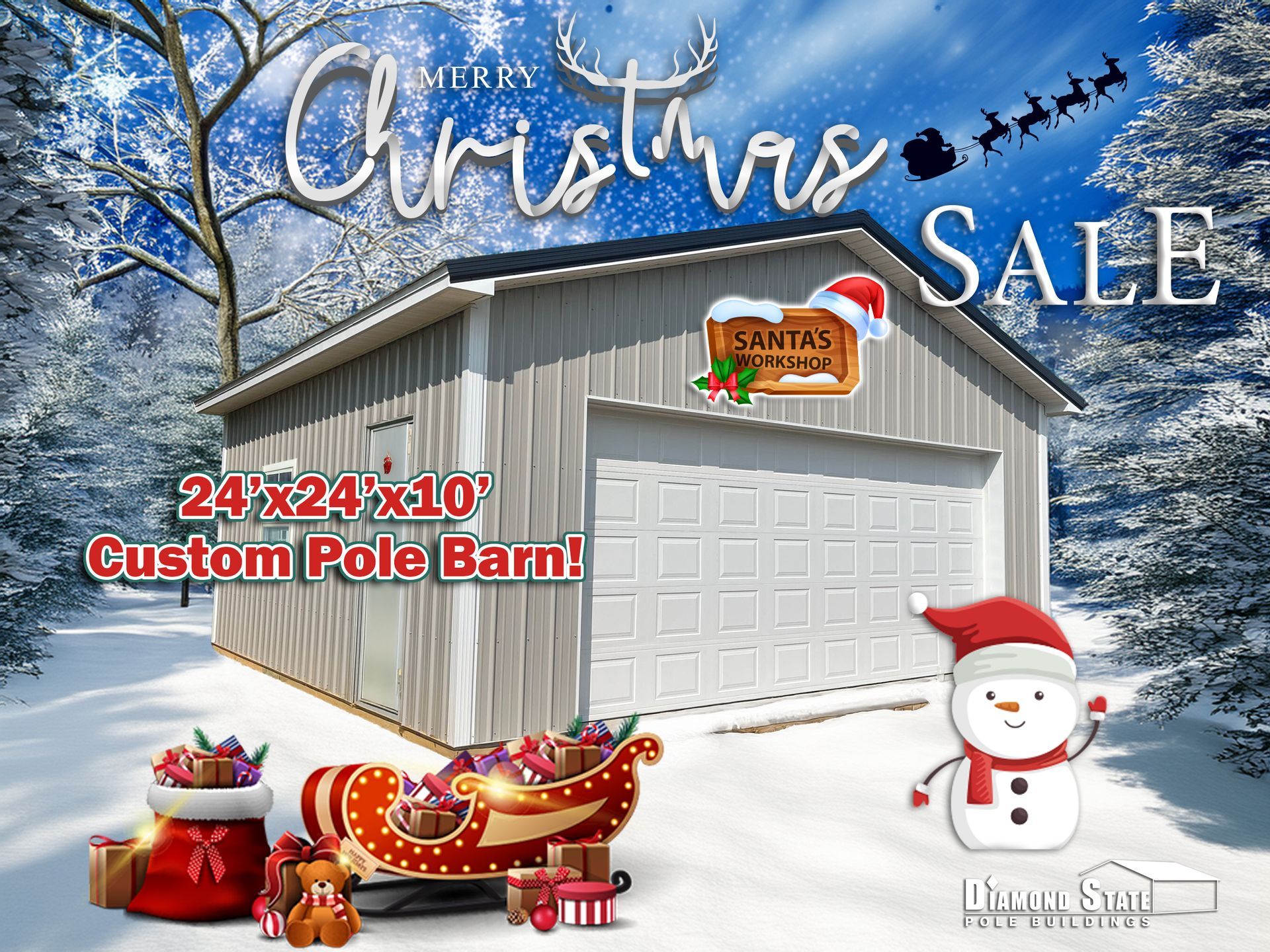 Give the gift of space with this incredible deal from Diamond State Pole Buildings! You can purchase this 24’x24’x10’ custom pole building for just $18,995 or only $150.13 per month with $0 Down!